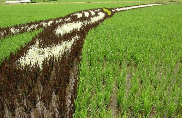 Farmers creating the huge displays use no ink or dye. Instead, different color rice plants have been precisely and strategically arranged and grown in the paddy fields.