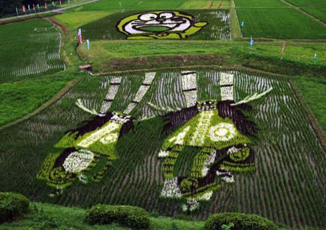 Smaller works of crop art can be seen in other rice-farming areas of Japan such as this image of Doraemon and deer dancers.
